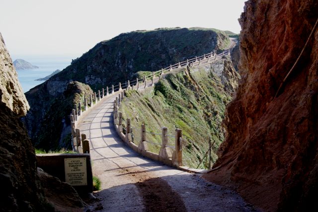 Sark consists of two main parts, Greater Sark to the north, and Little Sark to the south. They are connected by a narrow strip of land called La Coupée with a daunting100 metre drop – and thankfully, protective railings. The railings were only erected in 1900; and before then, it’s said that children would crawl across between the two on their hands and knees to avoid being blown over the edge.