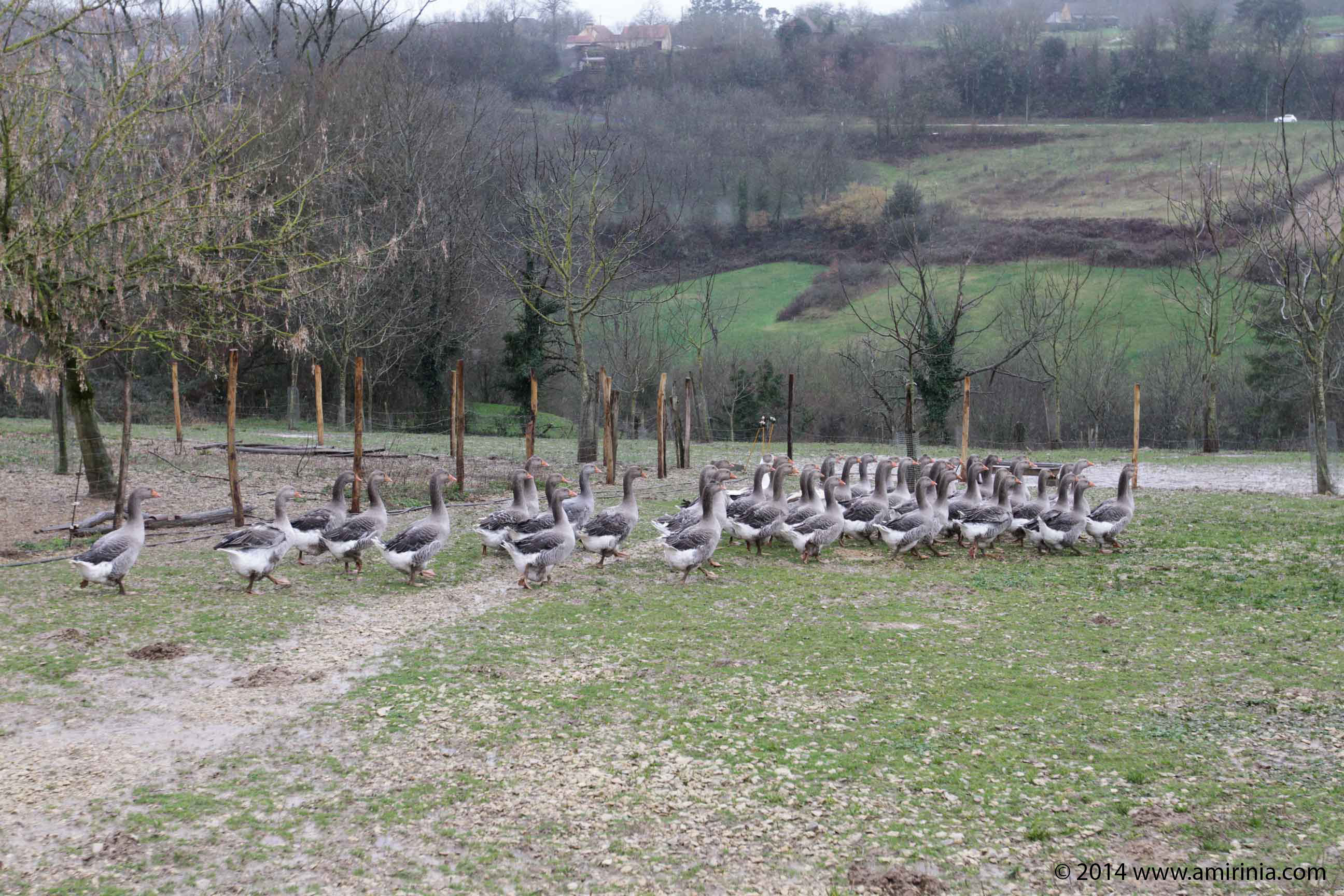 While we were in the area and to complete our full exposure to the goose, we visited a farm where the geese are bred and readied for market. Despite being ankle deep in mud, yes it did rain while we were there, we saw for ourselves the free-range geese enjoying a large paddock and the benefits of a straw soft floored shelter for the night time and resting (or is it nesting?). As with all farms that breed animals for meat, we also saw the final fattening process and the, as humane as possible, killing method.