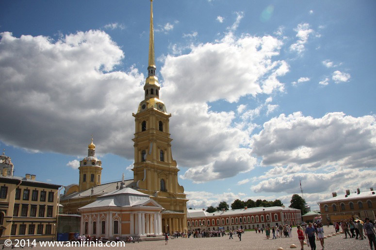 I crossed the river again to reach the Peter and Paul Fortress to explore this stronghold with fortified walls to defend the city. It is the birthplace of the city and the first structure which was built in St. Petersburg. The site was never used for what it was intended. Instead, in its short history, it has been used as a military base, government offices, the site of scientific experiments and an isolated and gloomy prison. The centrepiece of fortress and one of the most prominent buildings and landmarks in St. Petersburg is Peter and Paul Cathedral.