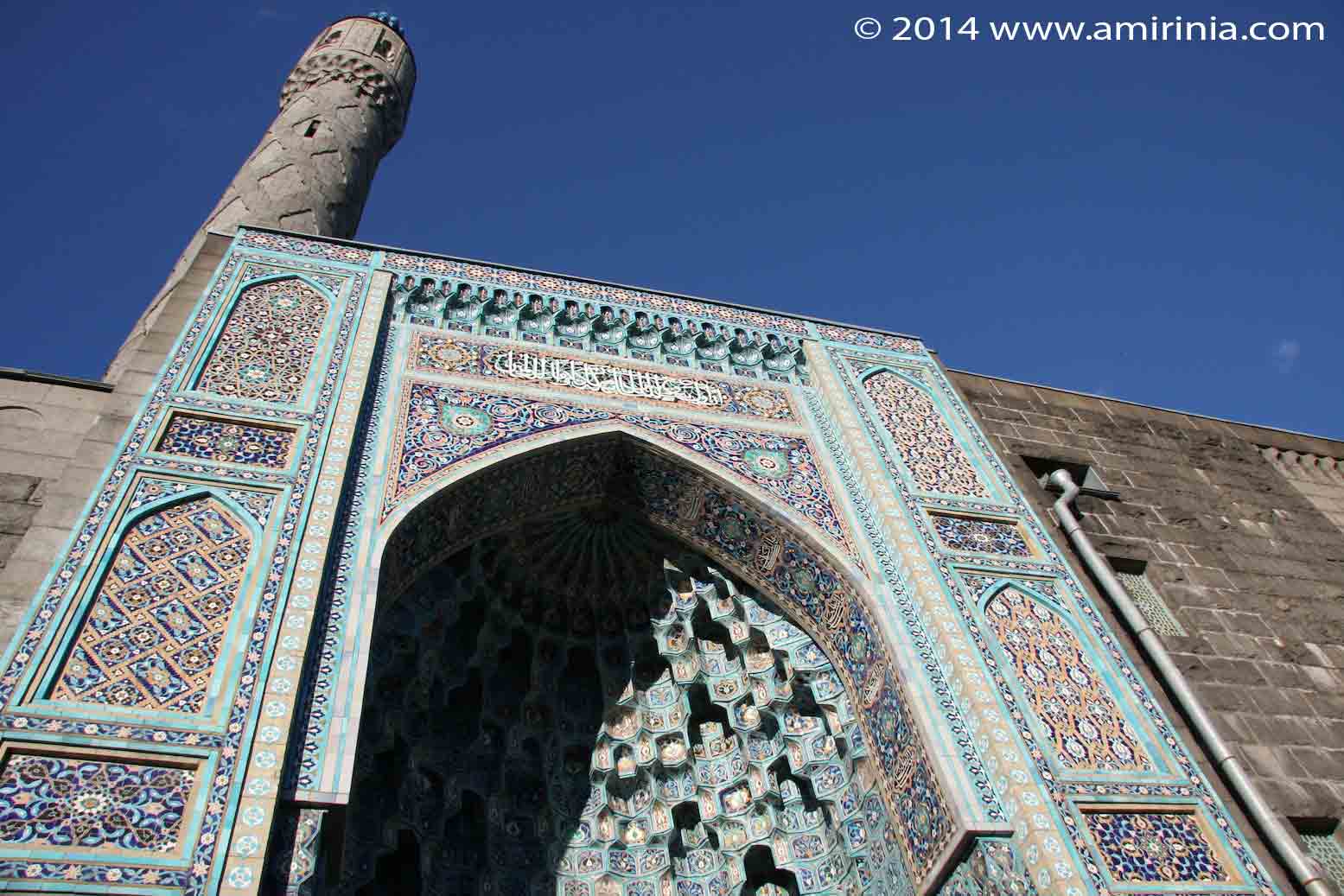 The caretaker escorted me inside the high ceilinged Mosque standing with its green marble columns. Several chandeliers were lighting the prayer hall, which was strewn with many handmade rugs and carpets. The mosque sanctuary, where the Imam leads the prayer, is another outstanding architectural feature combining sky-blue mosaics, marble and calligraphy enlivened by miniature paintings. A large wooden pulpit, made of walnut next to the sanctuary, is where Imam delivers his speech from.