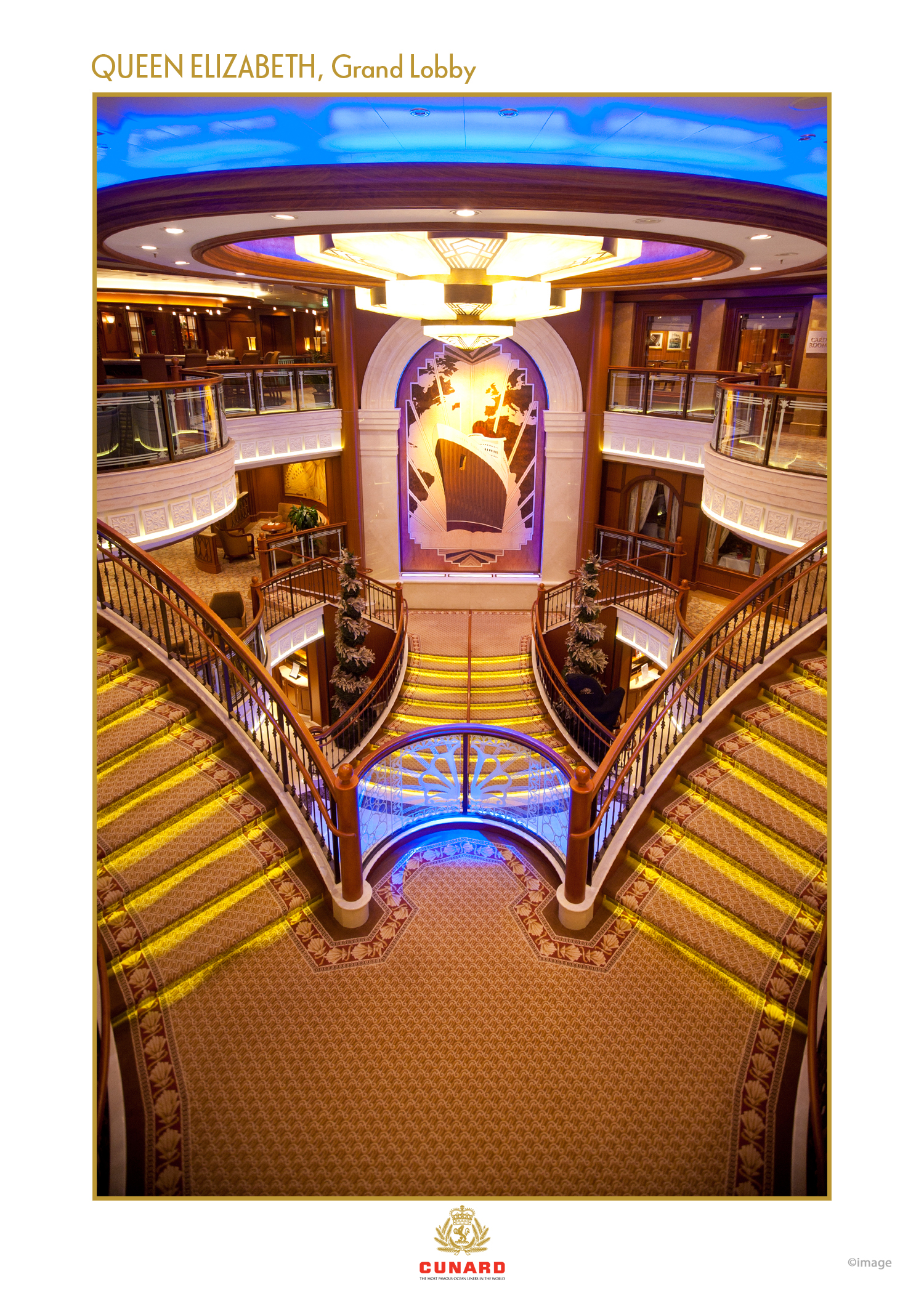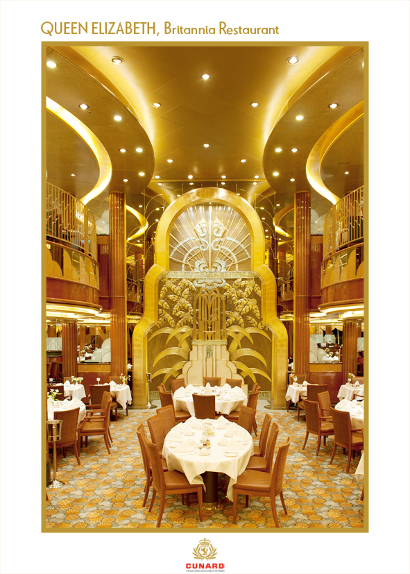 Next morning – not up at the crack of dawn – more a relaxed recovery from the travel. It was time to explore everything that this super size floating hotel has to offer. We were already familiar with the Britannia and Lido restaurants so we started our exploring in the lobby. Not just any lobby, this atrium is spectacular with ascending staircase dominated by a fabulous marquetry masterpiece of the original Queen Elizabeth by David Snowden. This is where we found the Reception Desk, Tour Office and Internet Room. The size of this ship precludes me getting everything in its proper order, plus the amount of walking involved on a daily basis saved us the customary striding out round and round the open deck for exercise.