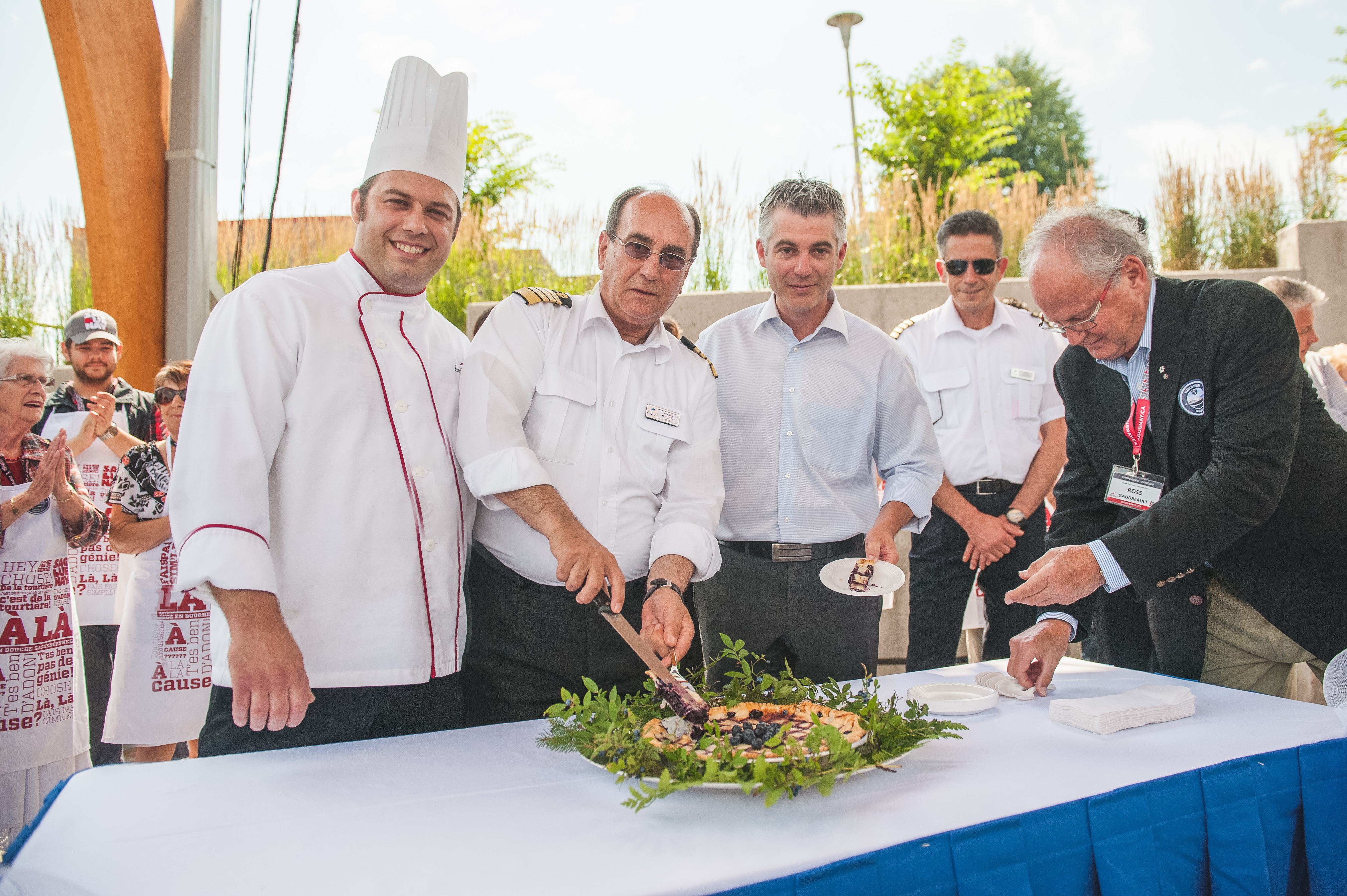 The cruise ship Marco Polo, formerly named Aleksandr Pushkin, owned by Cruise & Maritime Voyages, docked in Saguenay on Saturday, August 15, 2015. The Saguenay port of call offered an extra special reception to celebrate the ship's 50th anniversary. Local residents and visitors alike showed their support with a warm welcome for the captain and dignitaries. Fifty blueberry pies were offered and beautifully presented by fifty individuals proudly dressed in Saguenay's colors. Attendees had the opportunity to have their picture taken in front of Saguenay's sculpted letters by a professional photographer. The Marco Polo, carrying 848 passengers, mostly from Britain, and the 356 crew members, will dock once again in Saguenay on September 26, 2015.
