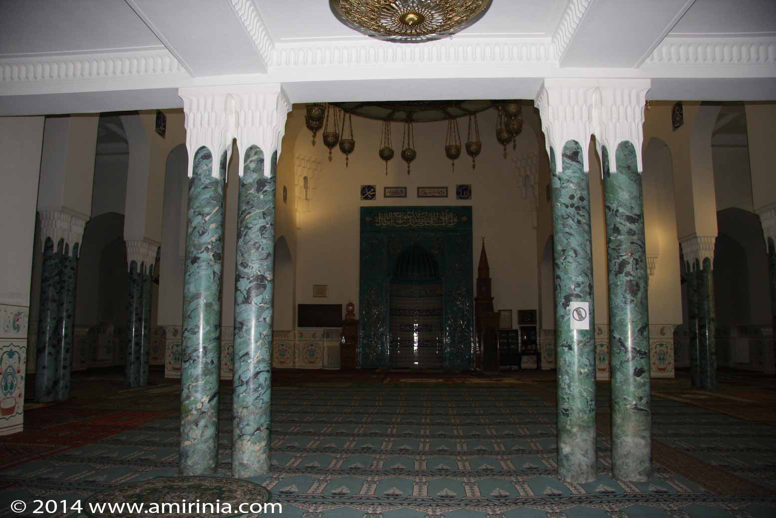The caretaker escorted me inside the high ceilinged Mosque standing with its green marble columns. Several chandeliers were lighting the prayer hall, which was strewn with many handmade rugs and carpets. The mosque sanctuary, where the Imam leads the prayer, is another outstanding architectural feature combining sky-blue mosaics, marble and calligraphy enlivened by miniature paintings. A large wooden pulpit, made of walnut next to the sanctuary, is where Imam delivers his speech from.
