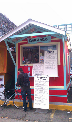 When one cart departs, someone is always there, ready to repaint and re-launch as something new. Chilango is one of the newest faces on SW 4th at the PSU pod. When I visited the other day, it took me a few minutes of reviewing the menu to realize this cart served Mexican food. Normally, the first items on the menus are tacos and burritos. At Chilango, it is bowls. After ordering my lunch from Veronica, I asked what Chilango meant and she told me it was a boy from Mexico City and then pointed at Caesar who was making my lunch and said – him!