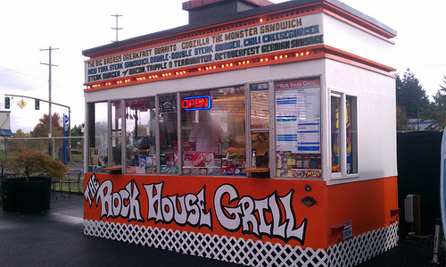 In a trailer that reminds one of the 50′s or maybe a boardwalk vendor, The Rock House Grill creates some great food to sate your needs- morning, noon or night. At Cartlandia out in east Portland, James has opened his shop after years of working in restaurants and honing his skills at the grill. He’s worked in small bars, been a line cook and even catered for concerts. If you can manage a crowd of rowdy rockers, you’ve proven you can man the grill.