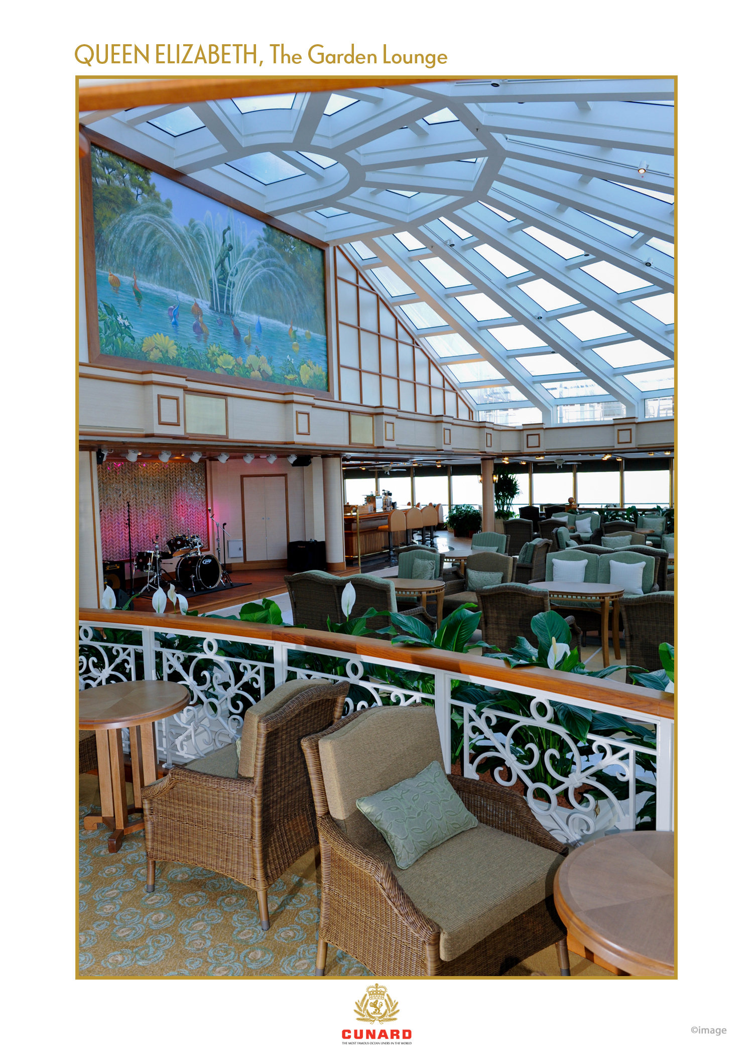 Next morning – not up at the crack of dawn – more a relaxed recovery from the travel. It was time to explore everything that this super size floating hotel has to offer. We were already familiar with the Britannia and Lido restaurants so we started our exploring in the lobby. Not just any lobby, this atrium is spectacular with ascending staircase dominated by a fabulous marquetry masterpiece of the original Queen Elizabeth by David Snowden. This is where we found the Reception Desk, Tour Office and Internet Room. The size of this ship precludes me getting everything in its proper order, plus the amount of walking involved on a daily basis saved us the customary striding out round and round the open deck for exercise.